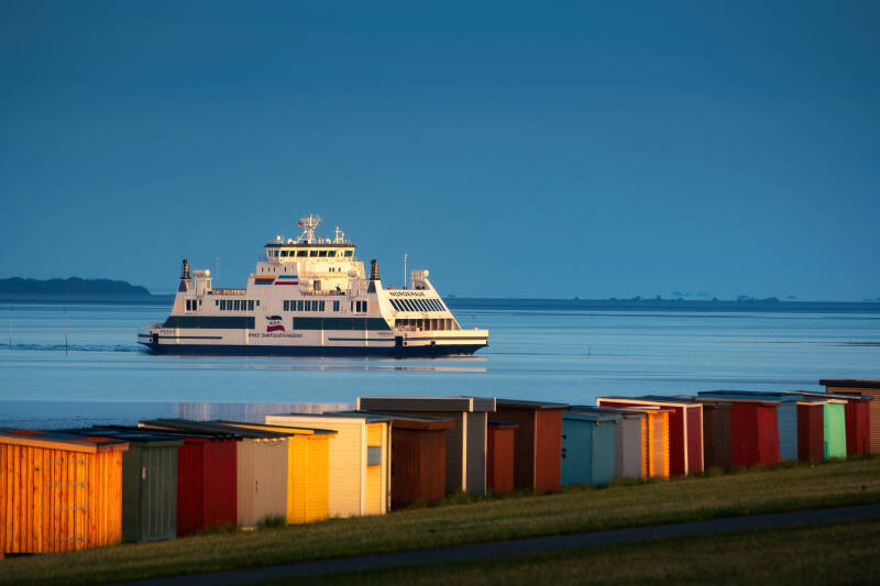 Mit einem Becker Kaffee in der Hand hab ich danach nach weiteren Motiven gesucht. Der alte Leuchtturm drängte sich förmlich auf, so wie er dort über den Deich lugte. Also am Deichfuss gewartet, bis sich die Sonne danebengesellte und dann war Feuer frei. Danach habe ich dann noch einmal das Telezoom aufgeschnallt und mich so positioniert, dass die Sonne direkt durch den Leuchtturm durchscheint und es wirkt, als wenn der Turm ein Leuchtfeuer hätte. Kurze Zeit später kam dann auch noch die erste Fähre in den Hafen, das hab ich mir dann auch nicht entgehen lassen.